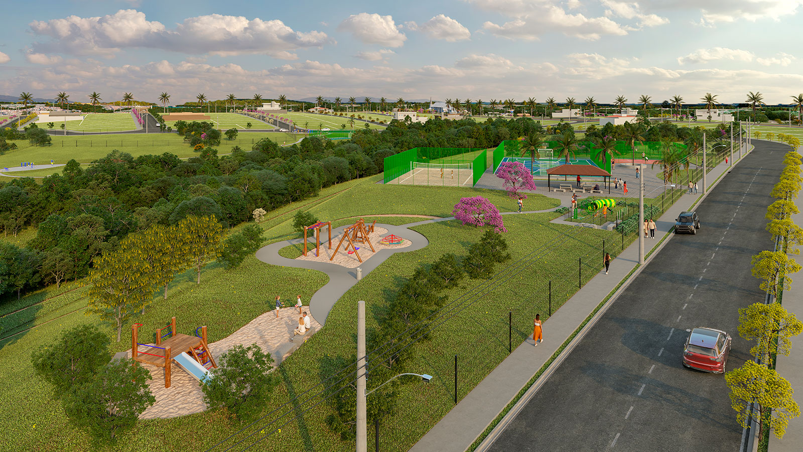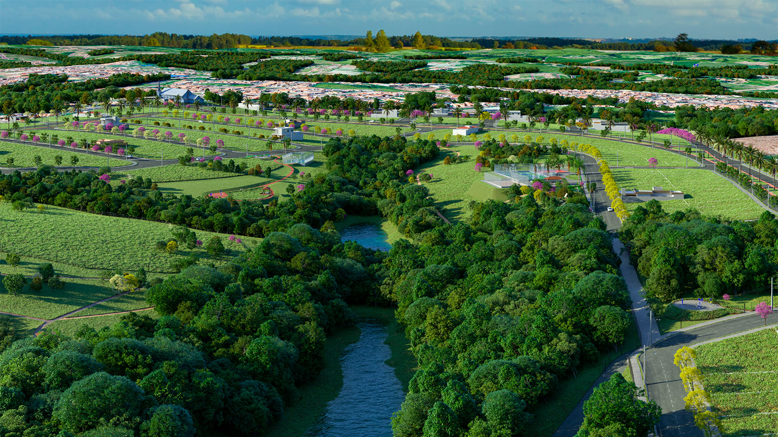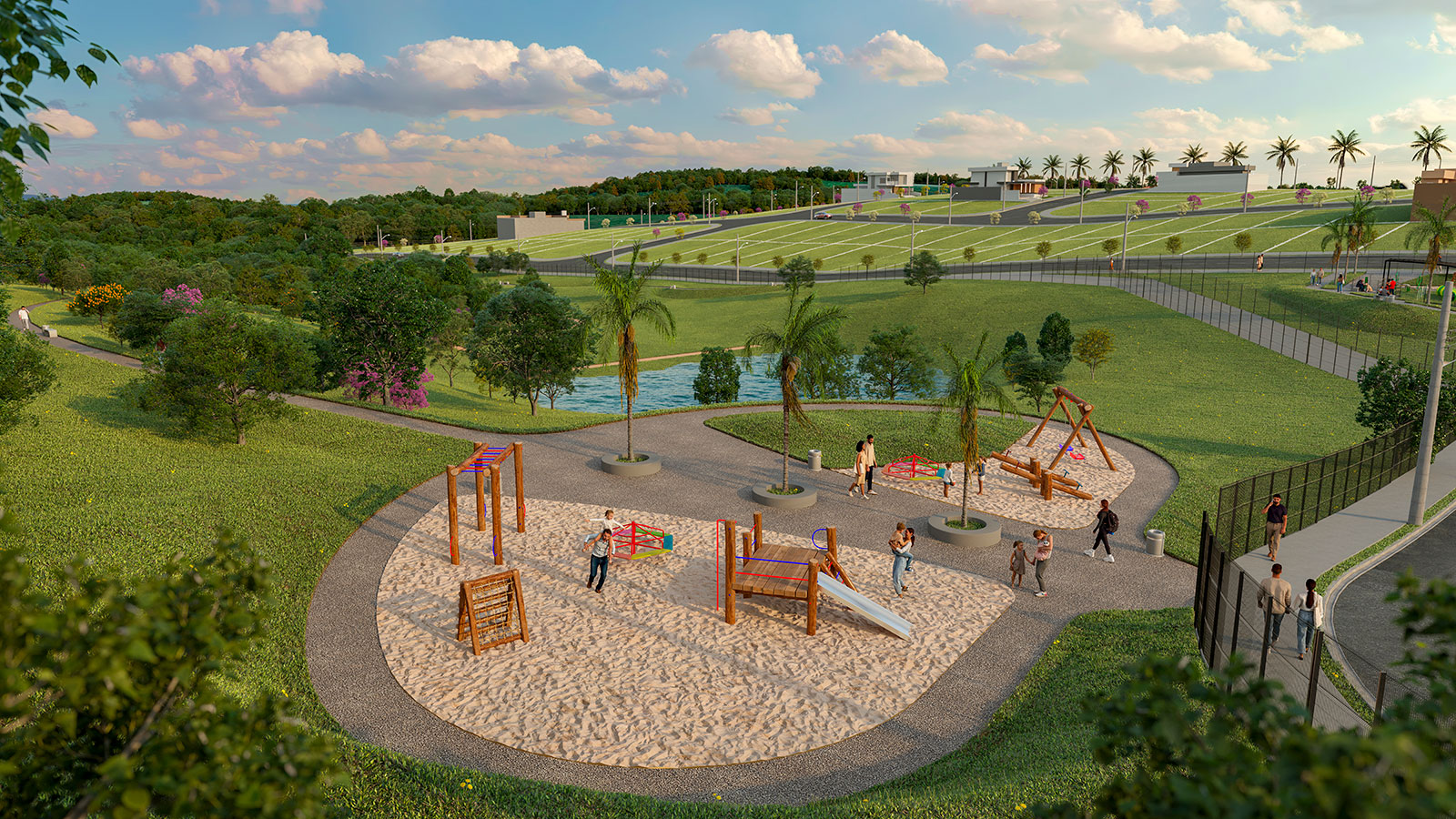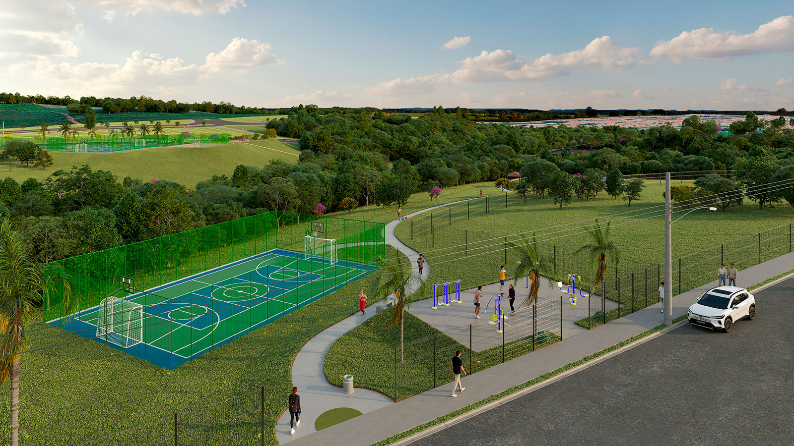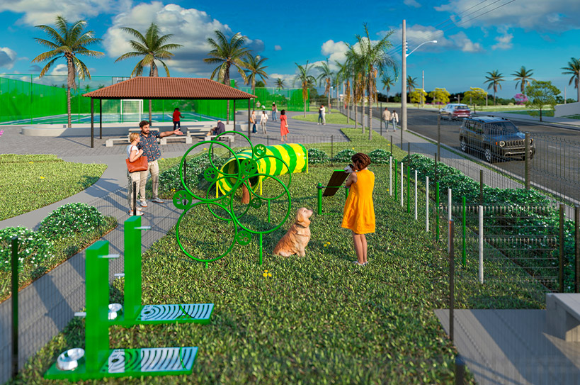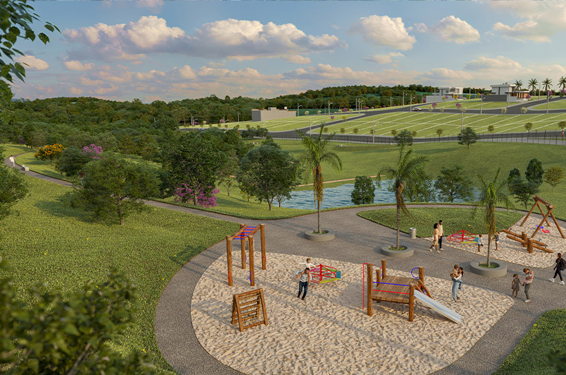 Lagos contemplativos, quiosques, academia ao ar livre, pista de caminhada, áreas verdes, praças, quadras, entre outros.