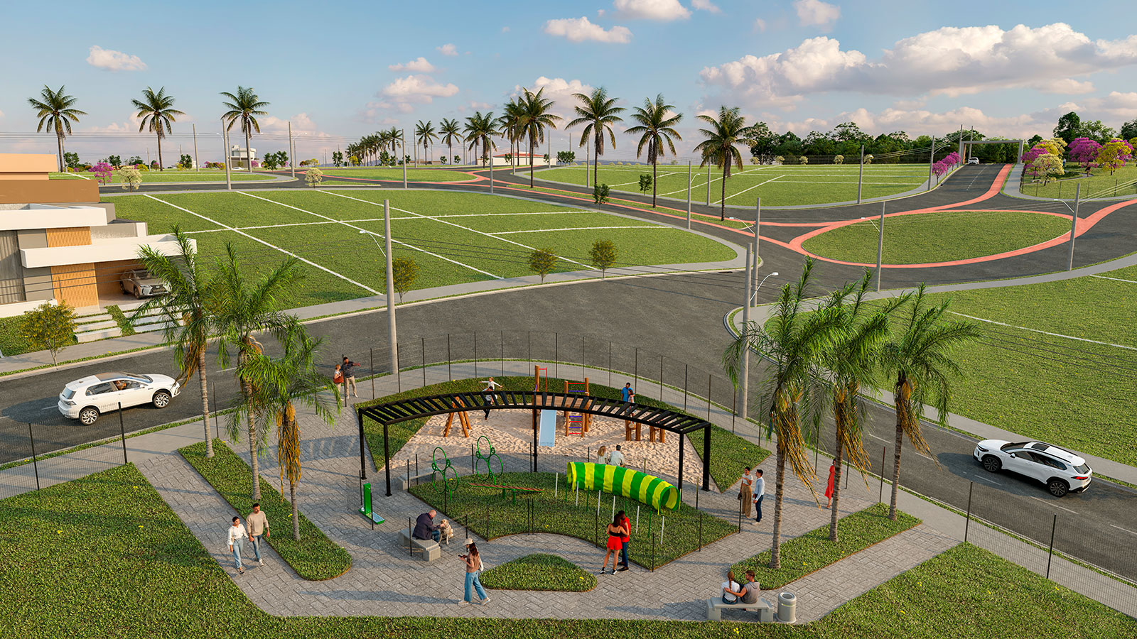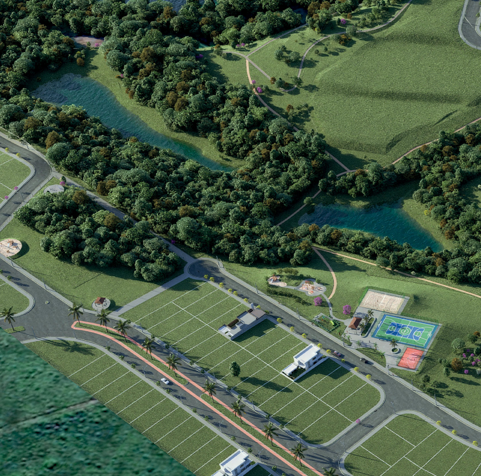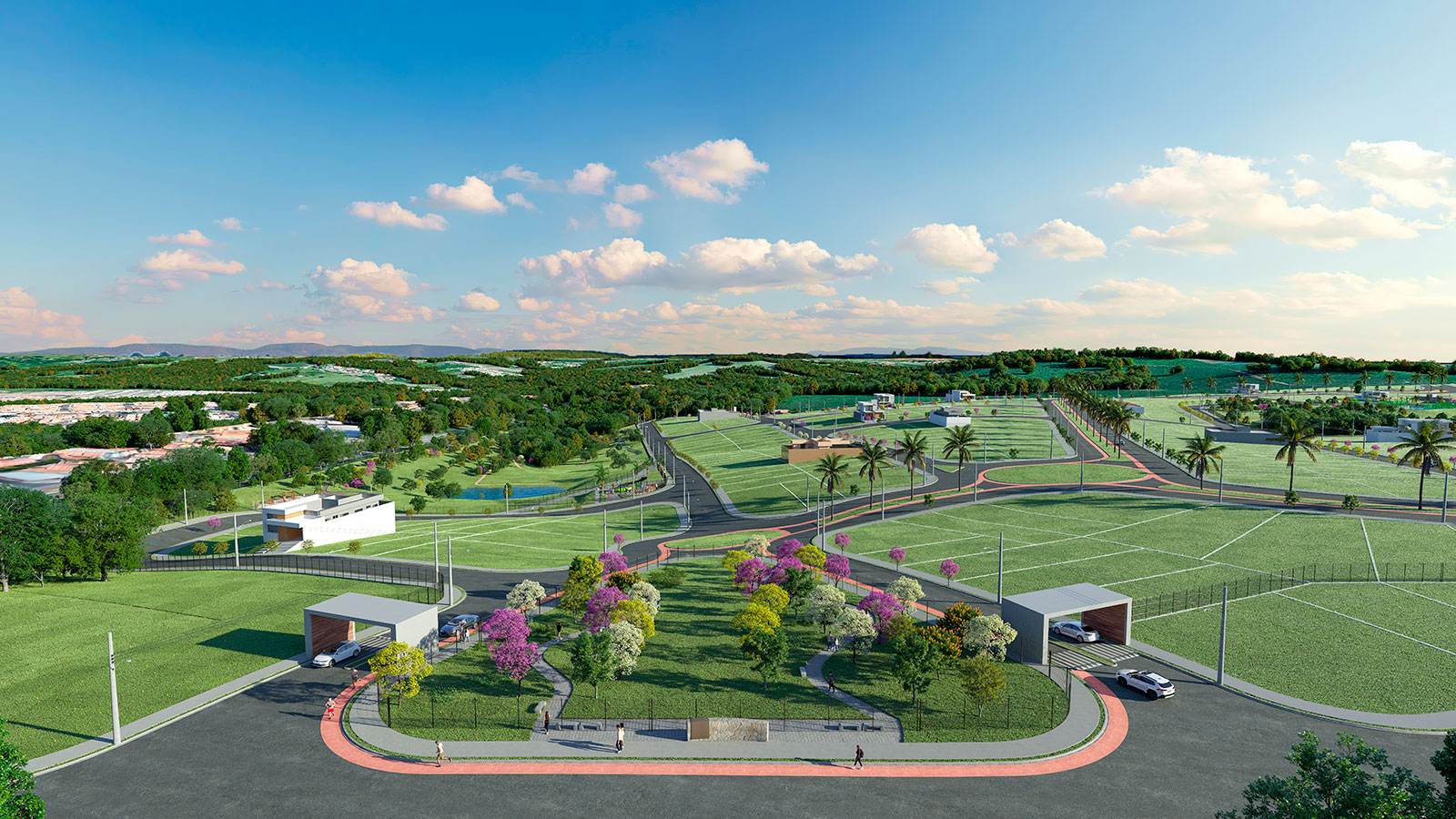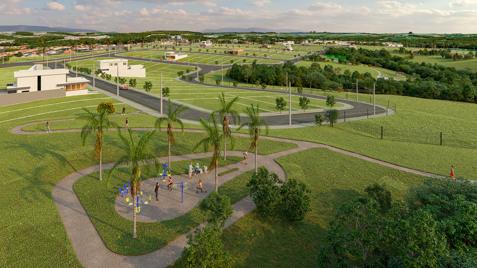 Lagos contemplativos, quiosques, academia ao ar livre, pista de caminhada, áreas verdes, praças, quadras, entre outros.