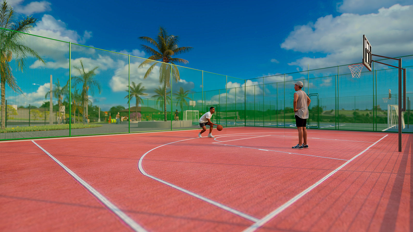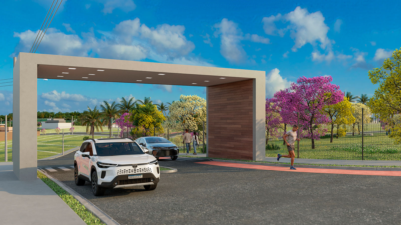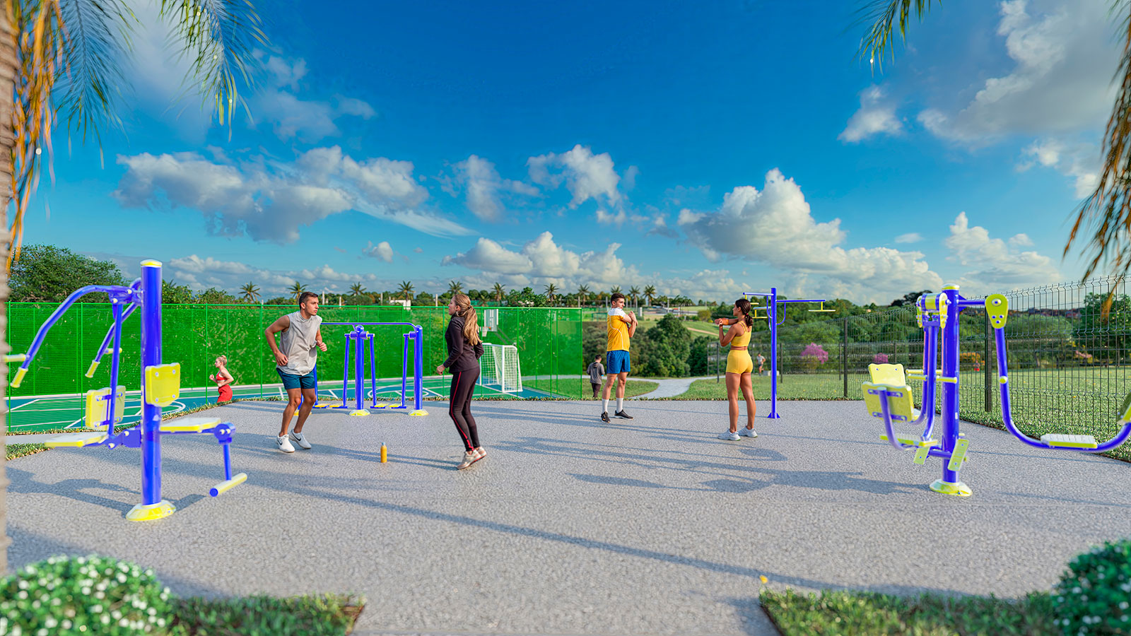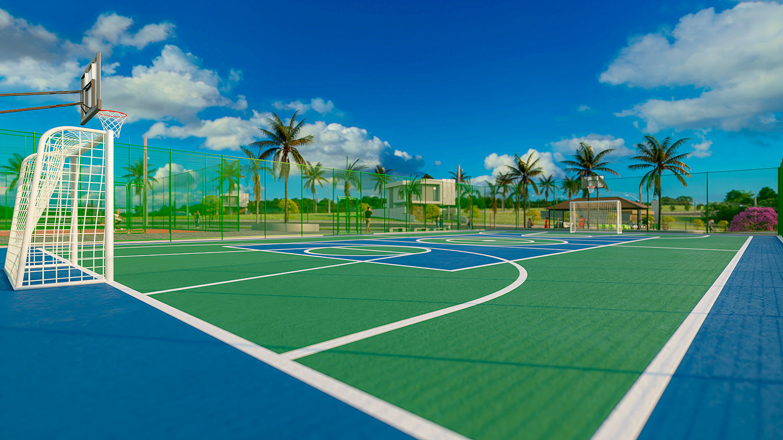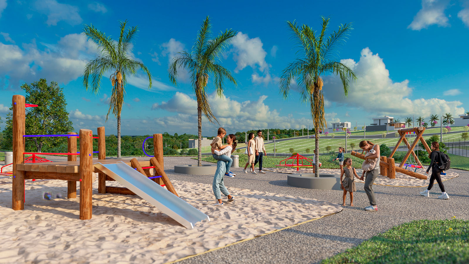 Lagos contemplativos, quiosques, academia ao ar livre, pista de caminhada, áreas verdes, praças, quadras, entre outros.